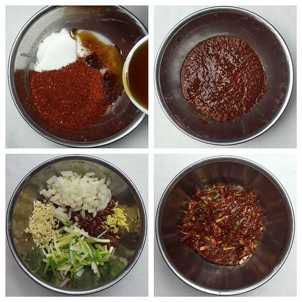 En un bol, combinar la mezcla de harina, escamas Coreano ají, salsa de pescado y azúcar. Deje que se enfríe. Una vez enfriado, mezclar la cebolla de verdeo, la cebolla, el ajo y el jengibre a la pasta y mezclar.