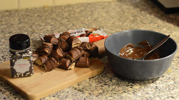 Ahora para la mejor parte! Preparar tus decoraciones por romper los Buenos restos de Kinder y derretir la mitad de la barra de chocolate oscuro. También utilicé algunas chispitas de chocolate que tenía por ahí, pero realmente no los necesita. Una cucharadita y todos Bob Ross en el pastel. Un toque aquí y allí una racha, usted sabe el taladro! Poner las piezas de Kinder Bueno en el arte del chocolate y listo, la tarta de queso más celestial en el mundo. Creo que este es mi mejor pastel. Todos los que probamos fue soplado lejos. Y lo mejor es, va directo a los muslos. Por el desagüe con tus resoluciones de año nuevo! Bah!