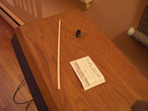 Deslice el palillo a través de los orificios del mango clip y apoye su kindle con el palillo. La presión desde el Kindle debería impedir el palillo de deslizamiento.