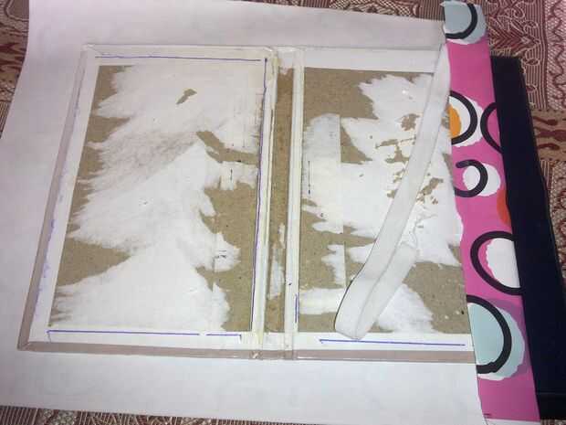 4. ahora, coloque su libro en el papel de cubierta para que el elástico está entre la tapa y el libro (ver foto si confundido)