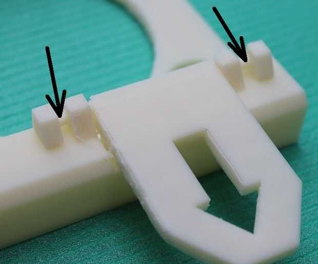 Nota: El extremo del perno real que inserta en la ficha no debe tener pegamento en él otra cosa no se pliega hacia arriba y hacia abajo una vez que todo está preparado. Poner el mezcla de pegamento donde indican las flechas y no exagere. Puede siempre agregar un poco más en la superficie más tarde.