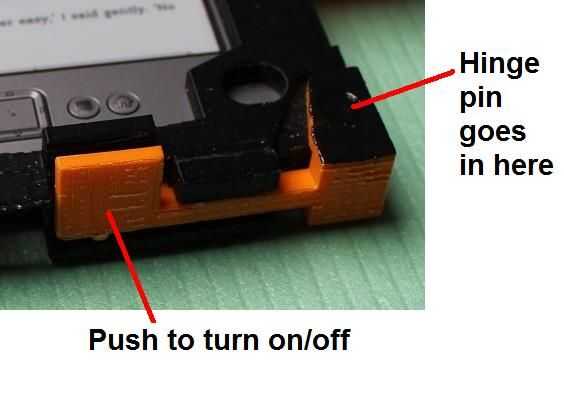Esta es una nueva adición mejora al diseño. Presionar la pestaña pone presión sobre el pequeña encendido y apagado botón en la parte inferior del Kindle. Presentar cuidadosamente hasta que apenas se ajusta muy bien. Una vez que han impreso se le verá como va a.