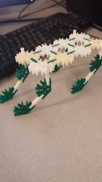 Conectar las patas al cuerpo conectando cada pierna verticalmente en el conector blanco, hacer esto para cada etapa, para las patas delanteras lo hacen a las piezas blancas frente muy dos. Para las piernas traseras del nuevo dos piezas blanco.