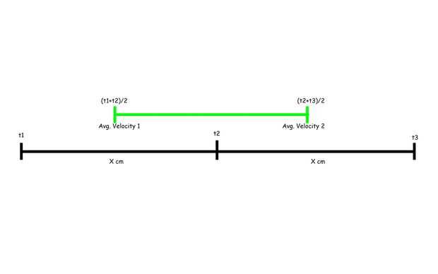 El objeto viajaba en promedio velocidad 1 en T1 = (t1 + t2) / 2y viajaba en promedio velocidad 2 en T2 =(t2+t3)/2