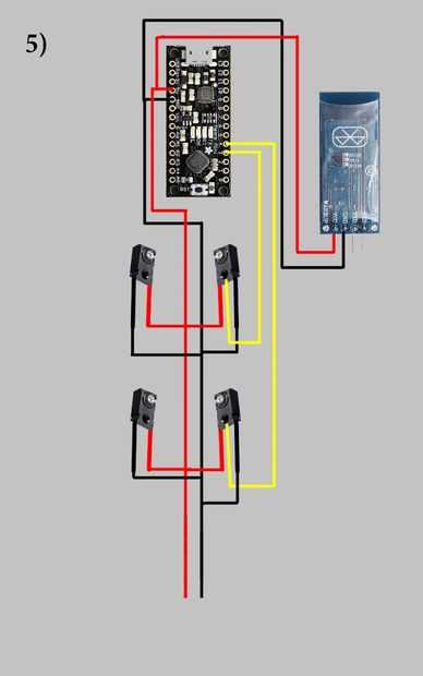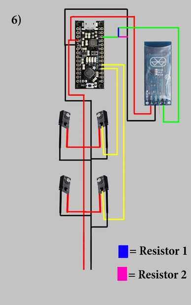 El pin de recepción no puede conseguir nada más que 3.3 V. o bien hará que el aparato se queme. Para evitar esto, usted necesita 2 sensores (marcados en azul y magenta en la segunda imagen). Para obtener 1/3 de 5V quitado, sus dos resistencias de la opción debe tener resistencias en una proporción 2:1! No importa lo mucho que realmente son, lo 2 es su relación. El larger resistencia de las dos resistencias se conectará a tierra. Más pequeños conectarán a un cable se conecta al PIN de recibir en la HC 06.