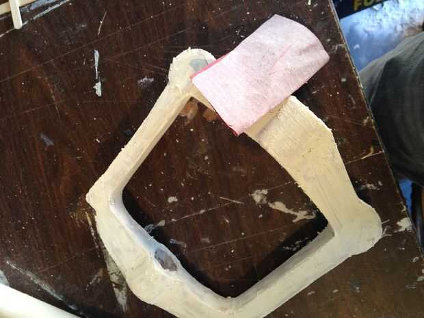 Después de unos 20 min, el Bondo es capaz de arena. Así que eliminar los baches grandes y hacer relativamente suave con grano 60. Más sobre la capa si es necesario. Asegúrese de que todos los de la espuma es cubierto con Bondo. Repita según sea necesario.