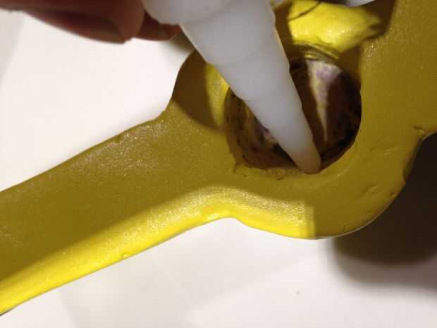 Luego, Aplique pegamento en el orificio de la manija. Introduzca el tubo todo el camino hasta él. Una vez, ir a la parte superior uno y poner una cantidad pequeña para ayudar a rellenar la zona que no se toquen el tubo. Usé una selección de diente para ayudar a distribuirlo mejor. Usted puede tomar una toalla de papel para limpiar cualquier exceso.