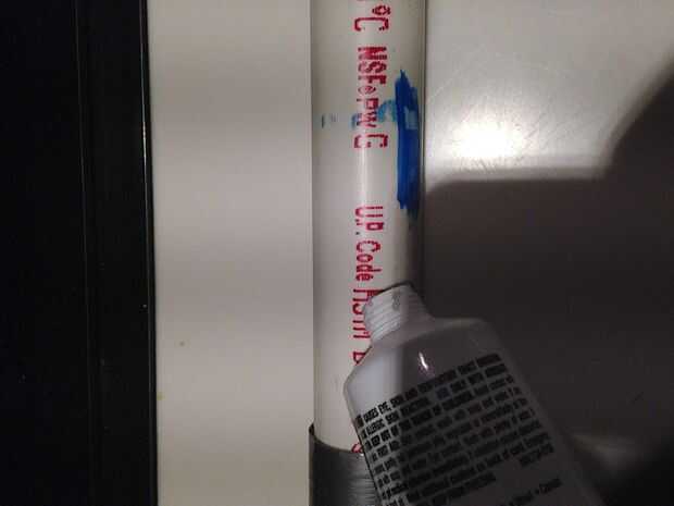 Si aplica el pegamento con el agujero superior en primer lugar, cuando se inserta el tubo, el pegamento se mancha todo sobre el tubo. Tan poner pegamento en la parte inferior primero, introduzca el tubo y luego pegar la parte superior para rellenar los orificios restantes.