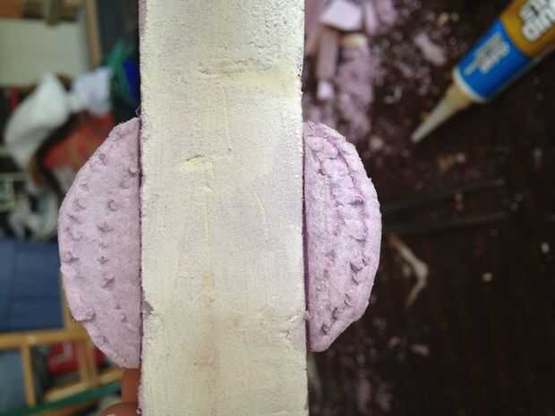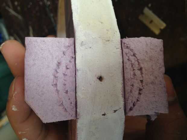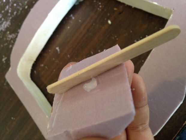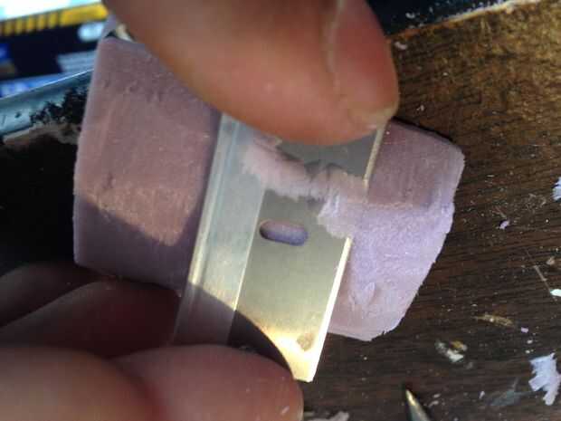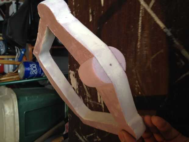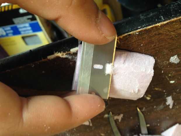 Debe tener arcos en ambos bloques. Retire los bloques de la manija y crear la forma curvada. Una vez que ha cortado al tamaño adecuado, tome el clavo líquido y aplique a la parte inferior del bloque curvo. Colocar en el mango y luego la cinta hacia abajo para ayudar a permanecer en el lugar. Una vez esté en su lugar y asegurada, arena hacia abajo un poco.