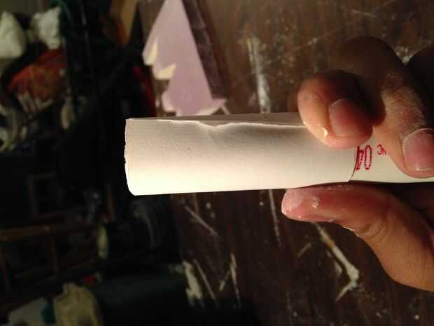 Cuando el compuesto de juntas esté completamente seco a través de todo el camino, debe ser capaz de doblar el papel de la espuma y lo elimine con hacia fuera rompiendo demasiado Spackle.