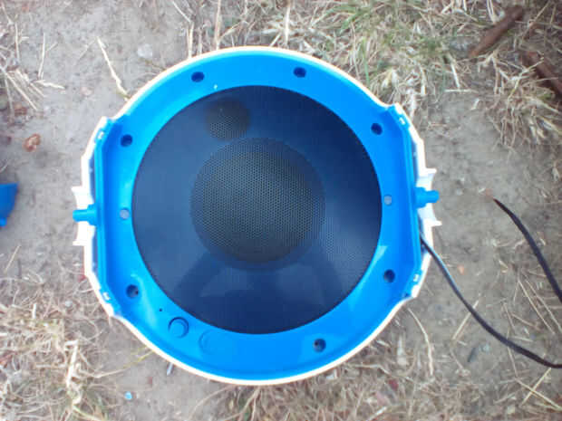 Podrás ver la batería azul solo conectada, cortar los cables cerca de la batería y retire la batería y reciclarlo. A continuación quiere conectar más cables a los cables de la batería para que la batería se puede ahora poner en el compartimento inferior (base del altavoz) asegurándose de que usted sabe que es positivo (rojo) y cual es negativo (negro).