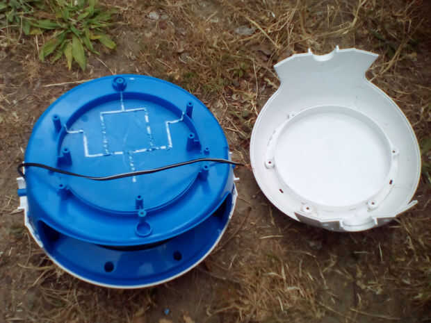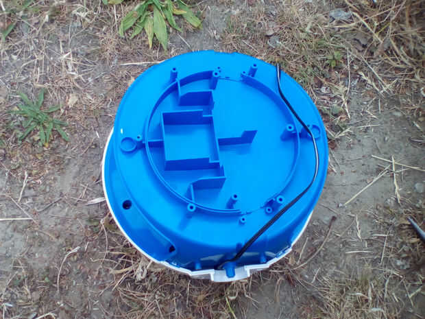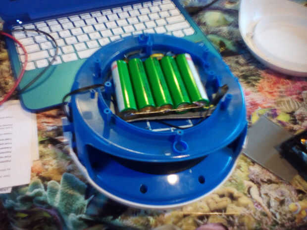 Bajo las patas de goma en la parte inferior de la base hay unos tornillos. Retire la goma y tomar hacia fuera de los tornillos y separe la base y verás como en la foto la superficie de base... colocar la parte azul en el altavoz como en la foto. Ahora quieren romper las lengüetas de plástico con unos buenos alicates para hacer espacio para las baterías y quite también el peso del metal de dentro del compartimiento.