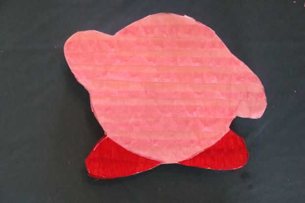 16. ahora toma la marca rojo y corte como se muestra a pie de Kirby. Cubrir el pie en dos capas y pegar hacia abajo usando el pegamento líquido blanco como se muestra en esta imagen. Luego cortar algunas serpentinas de color rosa y cubrir el cuerpo principal y lo capa y pegar como se muestra. Luego hacer las mismas cosas a los lados de Kirby y de nuevo.