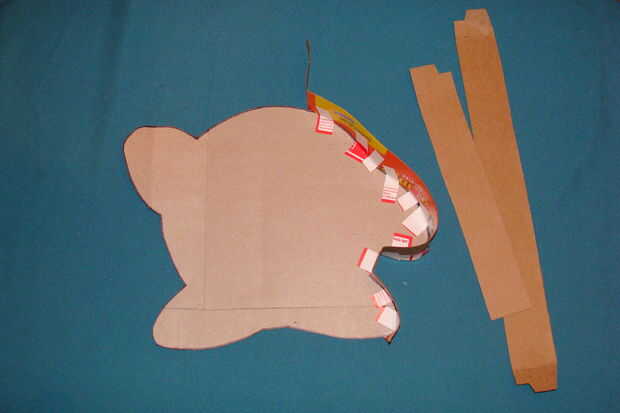 6. tomar una de las tiras delgadas de cartón y alinean en el borde de la base trasera y cinta adhesiva en el exterior e interior. Doblar la tira de cartulina alrededor de las curvas de la base trasera. Hacer esto hará que las paredes laterales de la piñata. Hacer una aleta doblada en la parte superior de la tira de cartón y no cinta adhesiva hacia abajo, esto es que el caramelo se colocará en (la apertura).