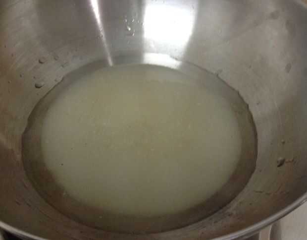 Paso 2: En una sartén antiadherente Vierta el agua y añadir el azúcar. Remover en el fuego hasta el azúcar se disuelva.