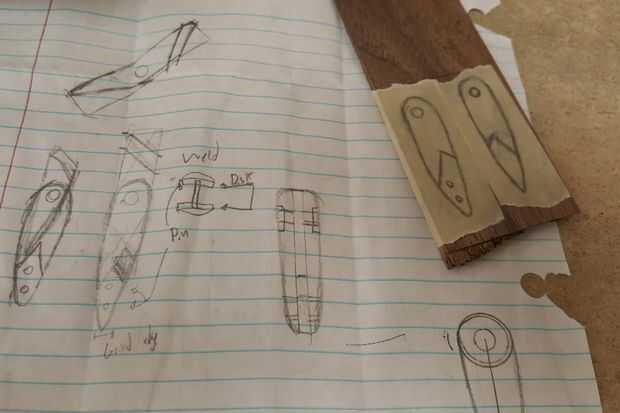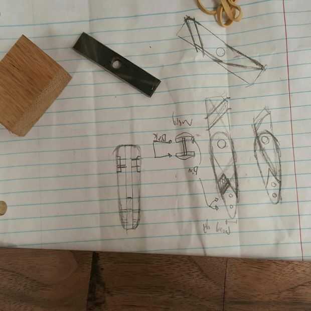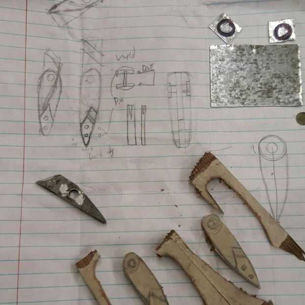 Después de la limpieza en la clase de tienda, me ha pasado a una pequeña barra de acero con poco carbono y a un retal de tablero rotos. Estoy a favor de reciclar, así que esto era una oportunidad perfecta para seguimiento. Puesto que el metal era muy pequeño y de baja emisión de carbono (1020), un kiridashi era perfecto. Arriba es un diseño preliminar y aproximados cortes con sierra caladora y amoladora angular.