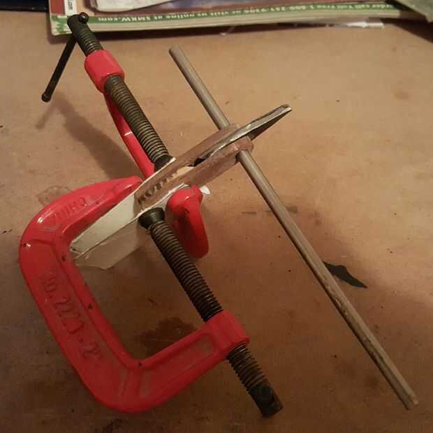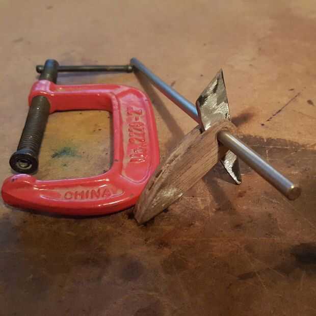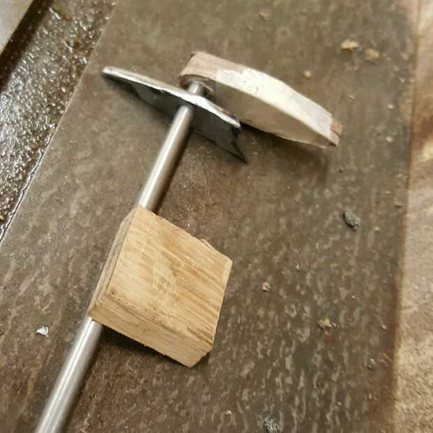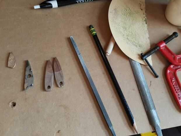 La acción (metal) fue casi tan grueso como la madera, así que grabó la zona y trazado mi diseño de antemano para que no aparten al utilizar herramientas. Usé una amoladora angular y tornillo de banco para corte y forma aproximadamente el metal. Puede utilizar un molino de rueda para "afinar" el metal como lo hice.