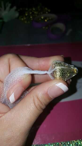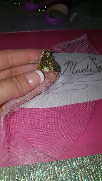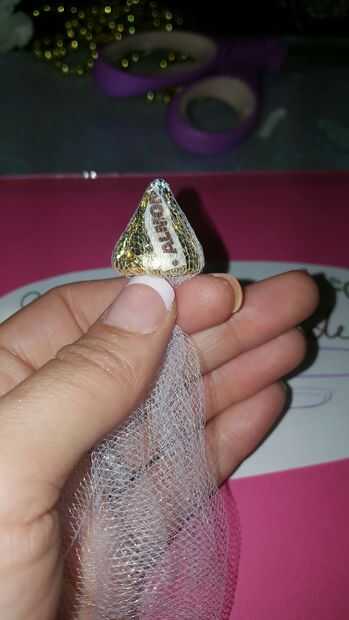 Paso 2 agarrar uno de los besos de Hershey que tú no has comido todavía y un trozo de tul. cortar un trozo de tul lo suficientemente grande como para cubrir kiss de Hershey y ser capaces de girar en el fondo como en las fotos.