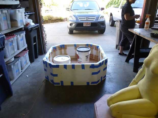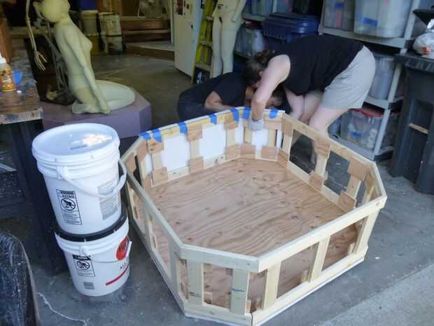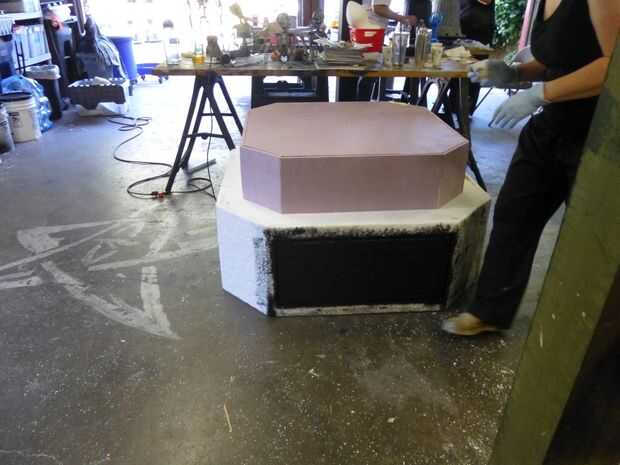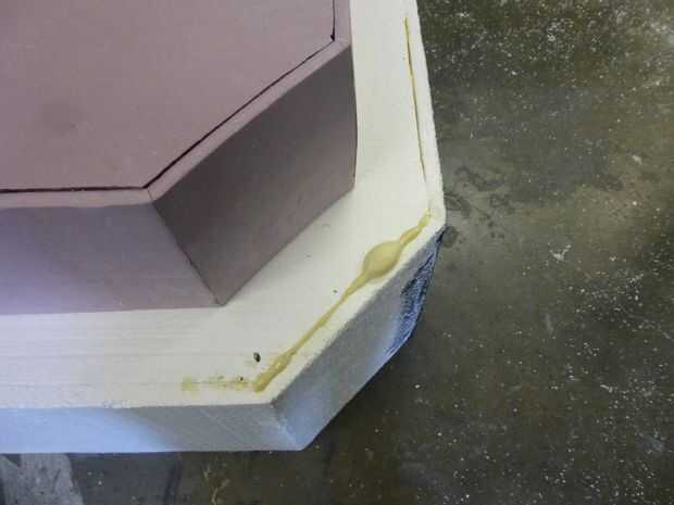La base principal está realizada con 1 "x 3" tiras de grapas con 4" cuadrado 1/2" madera contrachapada y una tapa de madera contrachapada de 1/2" de la leña. es 48 "x 48" x 20 "con los ángulos cortados en un ángulo de 45 grados. Cubrimos toda la base en 1/2" la espuma de poliestireno pegado abajo con pegamento del gorila.