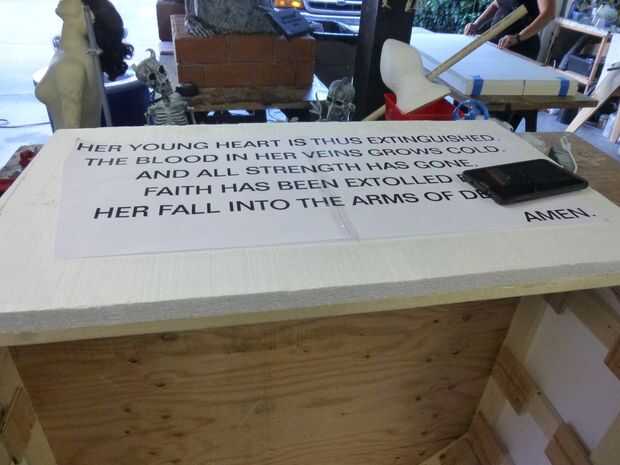 Usando un cuchillo xacto las letras se tallan hacia fuera. La espuma blanca se limpia con un estropajo de cocina y luego toda la superficie está ligeramente pasada con una pistola de calor para sellar la superficie de espuma para pintar.