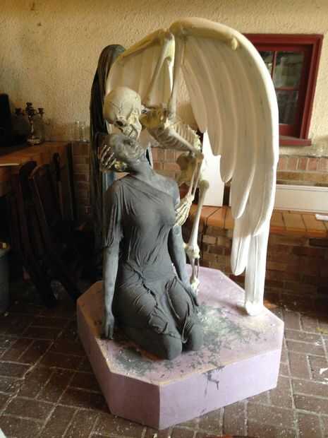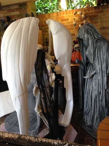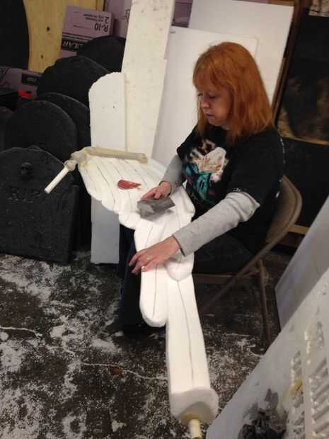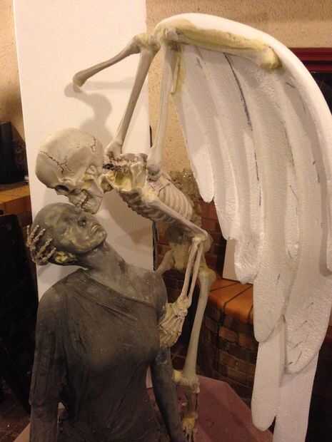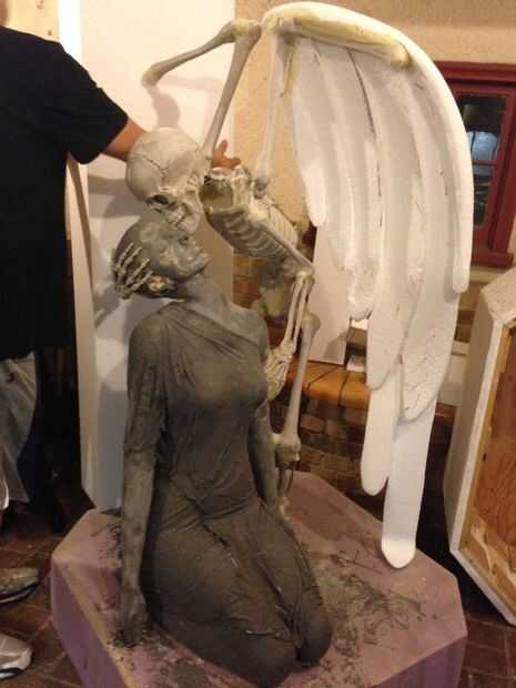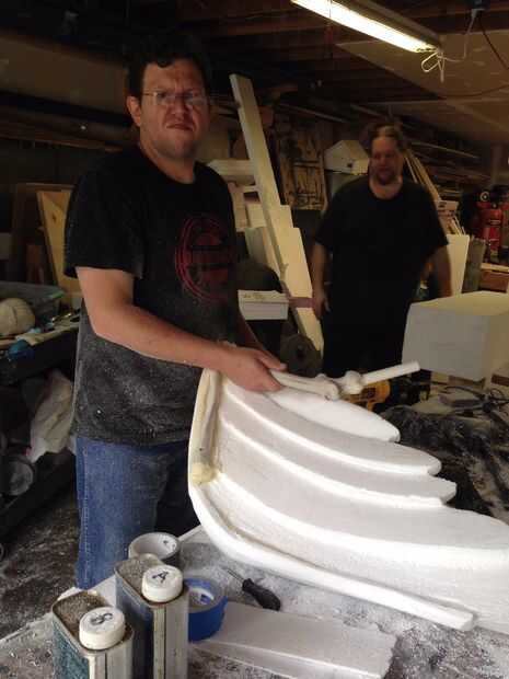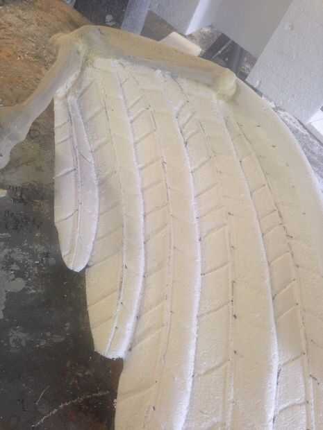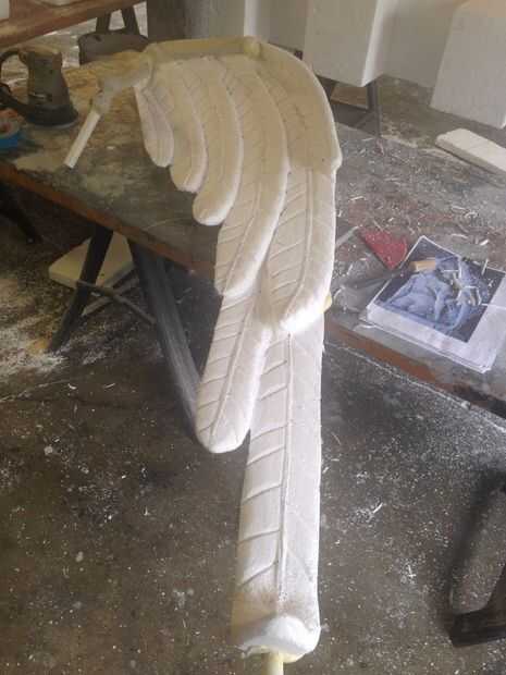 Las alas fueron talladas en dos piezas de espuma sólida para adaptarse a la estatua. Primero los bloques de espuma grande fueron reducidos usando un cortador de arco de fábrica de espuma de alambre caliente para obtener la forma básica.