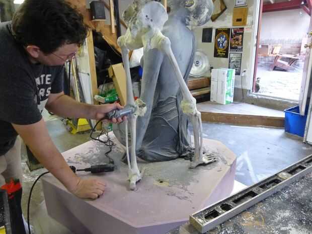 Varios corto 4" piezas de 1/2" PVC fueron insertados en la parte inferior de la figura femenina, pies de esqueleto, y ala consejos y los lugares perforados en la parte superior de la parte superior de base para que las piezas se pueden quitar pero permanecen en el lugar mientras que en la pantalla. A veces estos son arbitrados a como "batalla está parado".