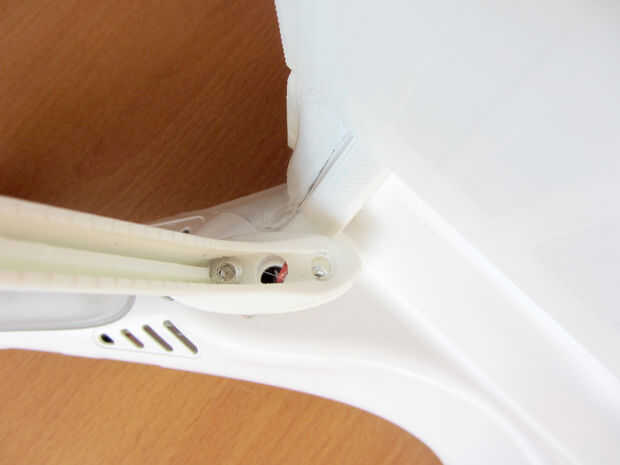 - Con el fantasma, enrosque los tornillos a través primero el tren de aterrizaje y luego a través de los orificios en la parte delantera los puntales de la bahía de la batería de P1Ultra.