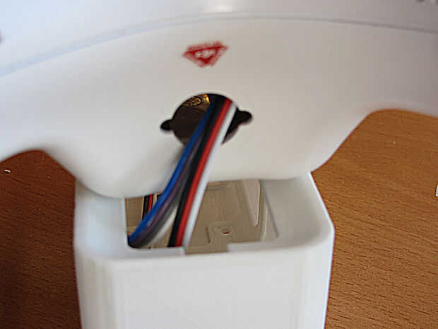 Con el Kit de fuselaje de actualización v2.0, es reutilizar el agujero LED/USB en cáscara del fantasma 1 como puerto de cableado. El montante trasero se canaliza y permite que los cables de cinta se enruten a la Bahía baja de la batería de la NAZA. Esto es útil para ambos el cable de extensión USB/llevado y decir un cable de control de inclinación de la NAZA a un cardán.