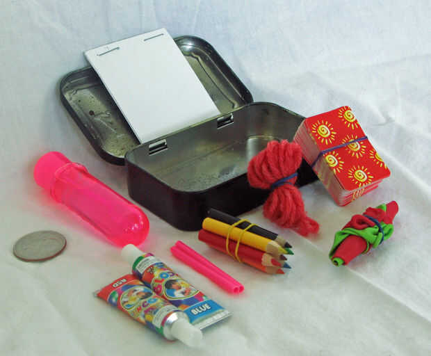 usé gomas de pelo pequeño y consolidar todos los elementos pequeños. Había congregado los lápices juntos, los globos, la cadena de cuna de gatos y la baraja de cartas.