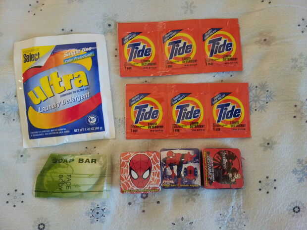 El hotel jabón y toallas comprimidas se deseche artículos en caso de que tengo que limpiar en el baño de un aeropuerto.