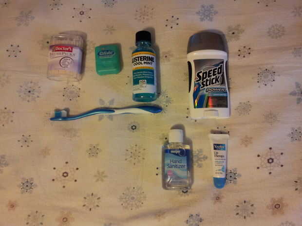No aparece en los artículos de higiene, es una barra de tamaño completo de jabón en un recipiente de viaje y pasta de dientes. (Yo debo han dejado mina en una ducha de camping.)