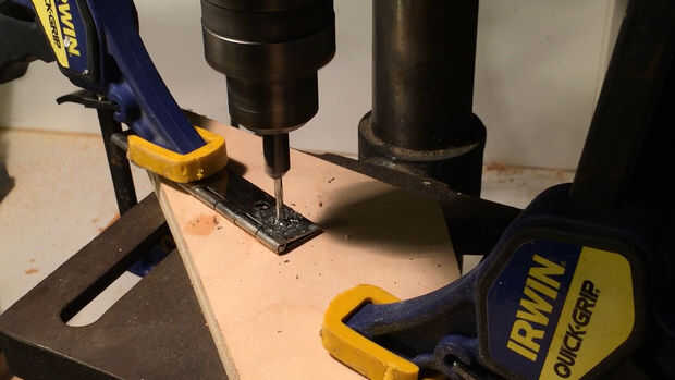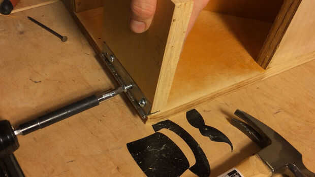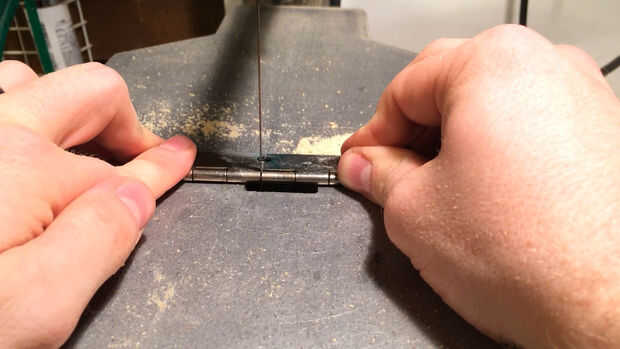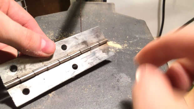 Yo corte una bisagra de piano porque tenía un polvo que recoge. Salvar cualquier pieza y reutilizalos cada oportunidad que tenga. Usé mi sierra de calar y un montón de lubricante durante el corte. Este es un paso importante que no debe omitirse cuando corte metal o perforación en metal. Las bisagras son baratas si usted necesita comprar un par. Os adjunto las bisagras a los más pequeños cuadrados de madera. Mina interior instalé para que aguanto y doblan las bisagras. Instalar sin embargo su corazón desea.