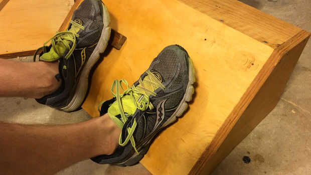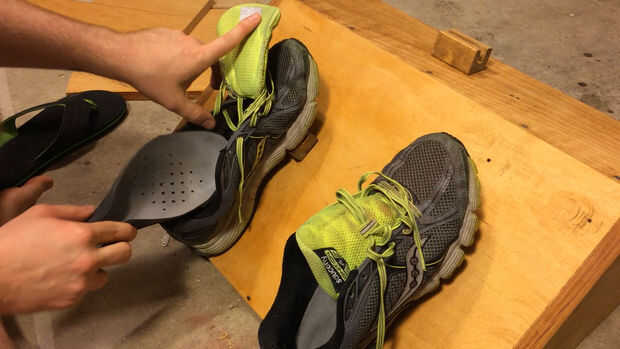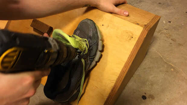 Seco ajuste con mis zapatos en para asegurarse de que su ubicación era la correcta. Usé un poco madera separador para ajustar el ángulo. Sólo usé tornillos largos con una arandela. Tres tornillos en cada zapato hicieron el truco. Puse una plantilla sobre las cabezas de los tornillos para evitar daños en mis pies.