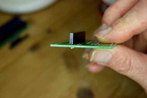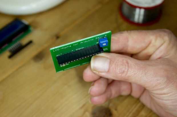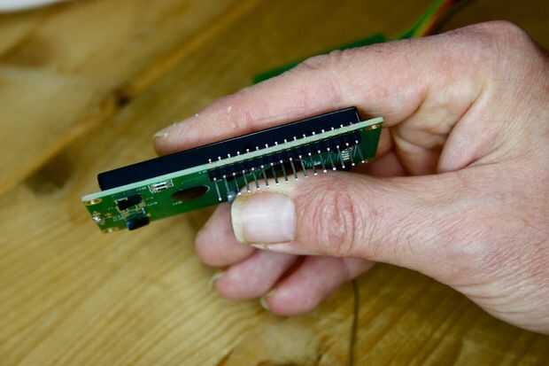 Para la soldadura de la matriz LCD pin, de hecho es un componente independiente que va a ser conectado a la tarjeta más adelante, siga las mismas instrucciones explicadas para el arreglo de la perno masculino de PCB