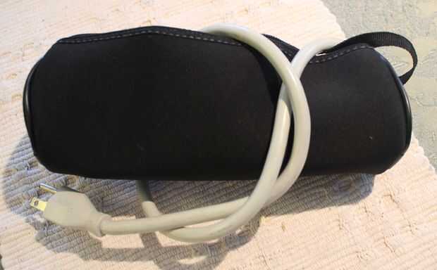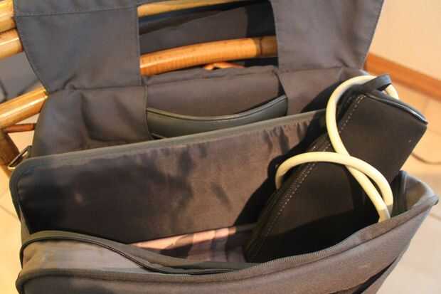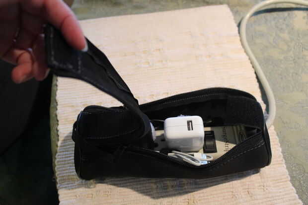 En esta configuración particular, puede conectar un cargador de iPad y un cargador de teléfono celular y también puede enchufar mi cargador de lap top. El cable de powerstrip sólo puede envolverse alrededor del kit de aseo.