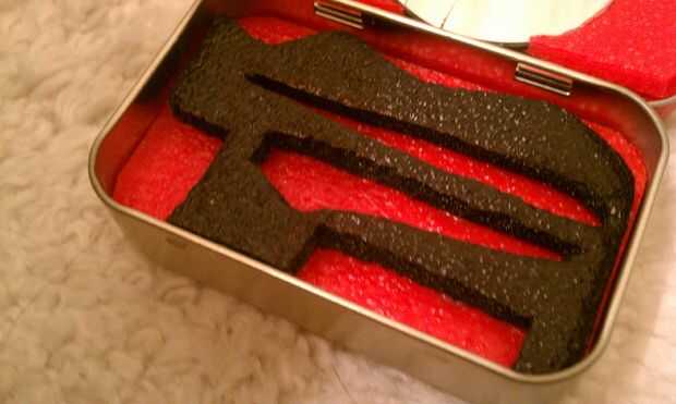 Ahora aplicar pegamento a la parte inferior de la lata Altoids y fijar la pieza roja y negra juntos contra el pegamento.