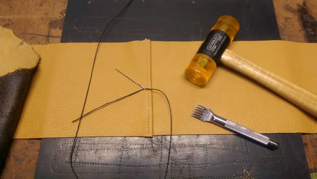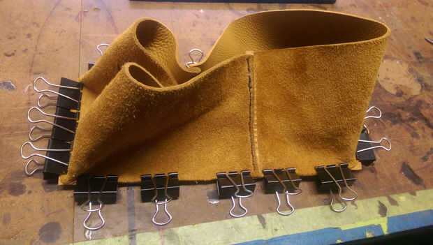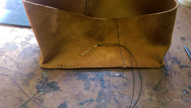Mi piel no era lo suficientemente largos para hacer la pared circular de todo una pieza, por lo que voy a tener las costuras a los lados. Desde los que será visibles, a ser doblados sobre y silla de montar cosida. Una vez que la pared, te pegue y coser a la base. En este paso, estoy haciendo todo el trabajo con la bolsa de adentro hacia afuera.