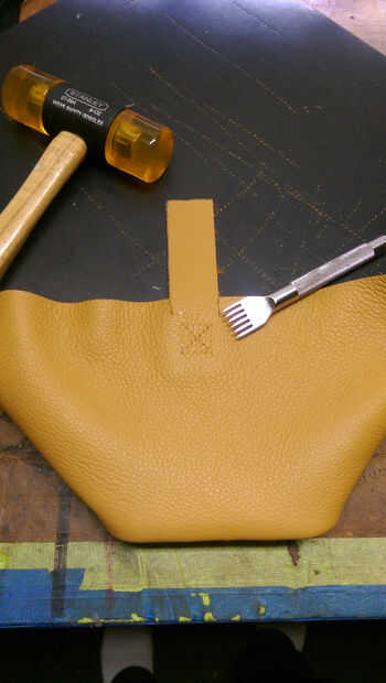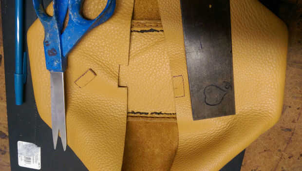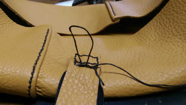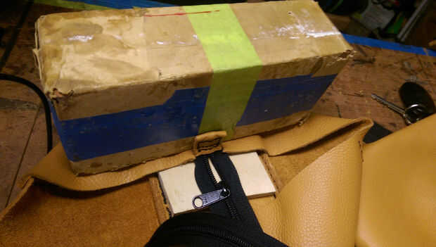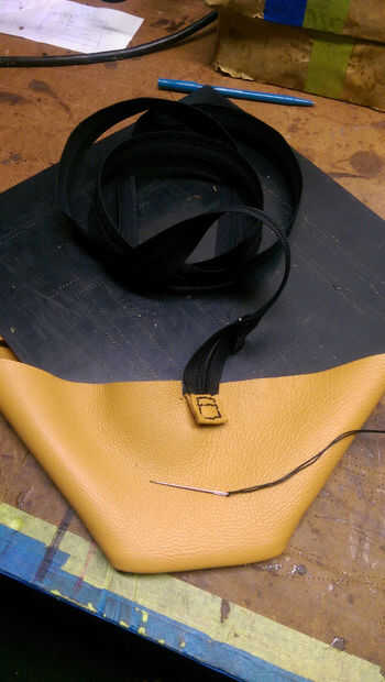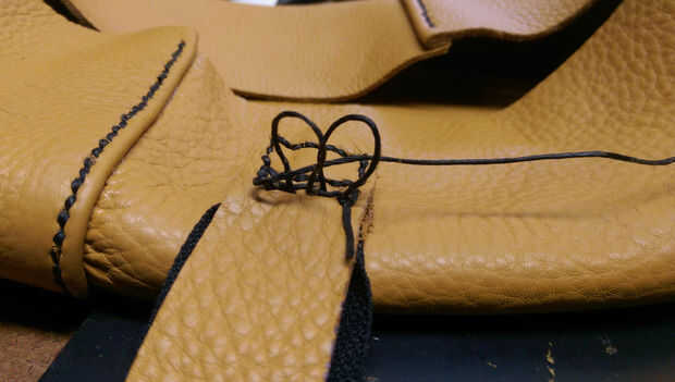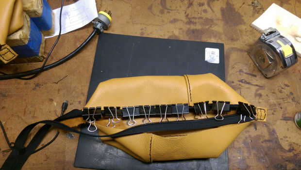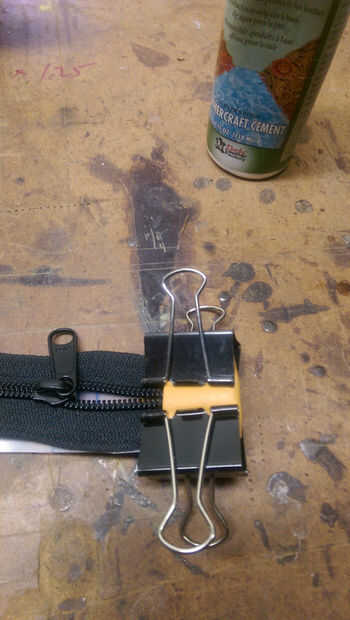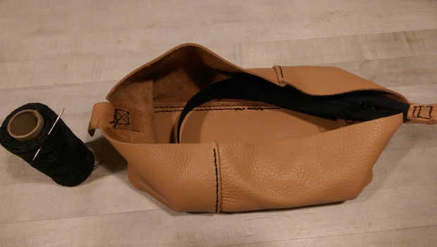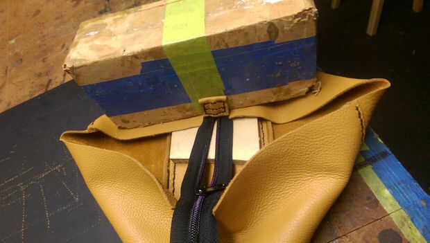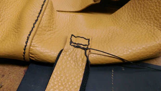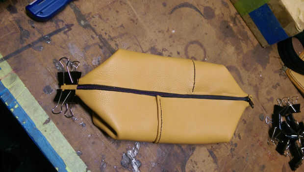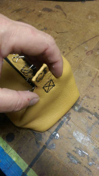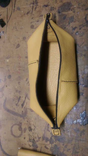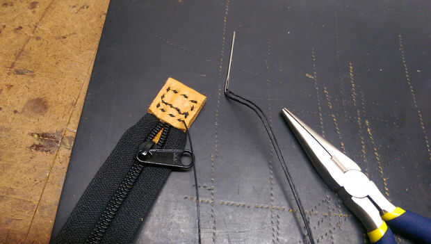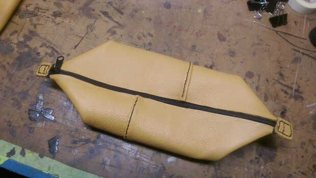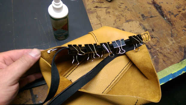 Mi idea era una pestaña en el extremo de la cremallera que se abre, luego coser esa ficha a la bolsa con la cremallera larga a la izquierda pero el regulador ya en la puntada. Luego cosió una pestaña abierta en el otro extremo para definir la longitud final de la cremallera. Luego, abrí la cremallera más allá de la ficha (sin sacar el regulador) y pegados a ambos lados de la misma para el cuero. Una vez que sabía exactamente donde pondría fin a la cremallera, I cortarlo, dobla la pestaña abierta alrededor de él y cosido final cerrado.