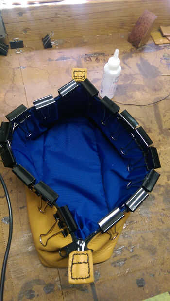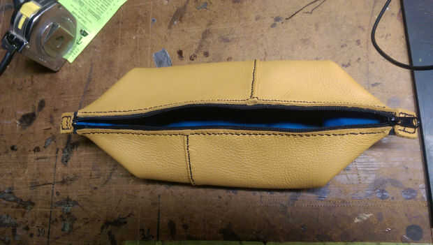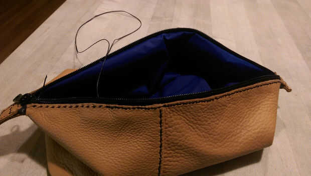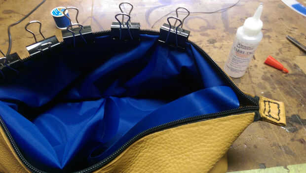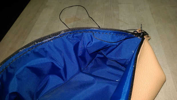 El borde superior del forro es doblado sobre y pegado y luego pegado en la parte inferior de la cremallera. Una vez que se encuentra pegamento, perforado a través de la piel, la cremallera y el forro y pespunteadas de todo.