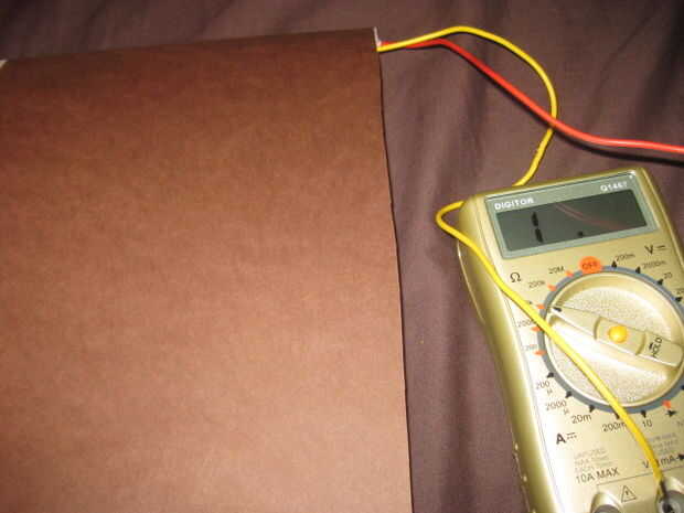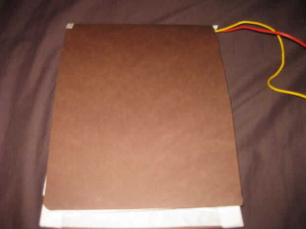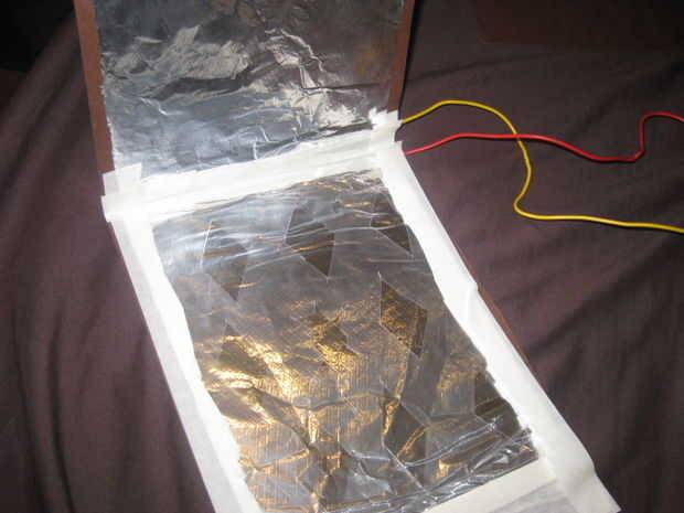 Coge un cartón (carpetas de Manila medio funcionan bien) y algunos el papel de aluminio. Poner un panel de la hoja en cada uno del interior paneles de la carpeta (que no deben tocar). Conecte un cable a cada uno de los paneles de papel de al.