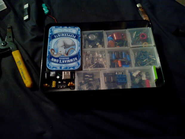 Es el momento de poner todos los componentes en los contenedores más pequeños y aquellos en la grande. Aquí tengo varios tipos de piezas ordenadas. Condensadores, resistencias, interruptores, potenciómetros, bobinas, LEDs, etc.. También tengo una lata de 'Altoids' con mis cables puente y una fuente de alimentación de la placa. Cualquier cosa que crees que sería útil y se ajusta. Si tiene sugerencias, por favor comenten.