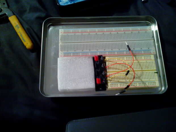 decidí que sólo tener los componentes no fue suficiente. así que instalé una placa dentro de la tapa de mi lata grande. Punto del lazo de un 400 y un 830 Atar punto. También pegué un altavoz del terminal con los cables de puente que soldado a él. Eso ayuda un montón con los cables que son demasiado gruesas o desordenado insertar en el protoboard. También pegué un trozo de espuma para almacenamiento inmediato de los componentes, muy convenientes. Otra vez todas las sugerencias son bienvenidas.