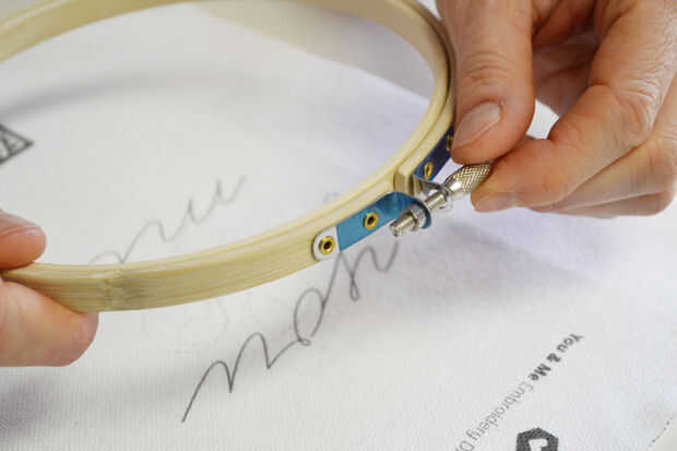 Quitar el aro de bordado y el interior del aro de detrás de la tela y el aro más grande en el frente.