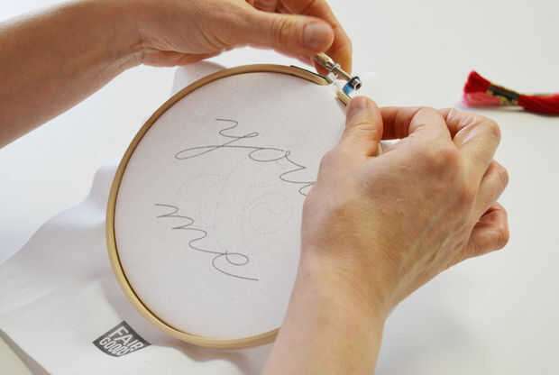 Centro el aro alrededor del débil círculo impreso en la plantilla. Apriete el tornillo mientras tira de la tela alrededor de los bordes. Es más apretado el tejido, mejor.