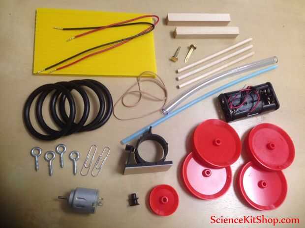 El kit incluye al menos 4 piezas de madera y un tablero plástico (cortado a la medida), 4 ruedas de la polea, aros 4 llantas, portapilas, polea de la transmisión de un, motor eléctrico, gomas, montaje del motor, tornillos, clips de papel, sujetadores de papel de latón y tornillos de ojo.