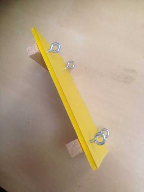 El chasis del coche se hacen de un tablero de plástico, reforzado por bloques de madera y tornillos de ojo que también dará soporte a los ejes de las ruedas. Así que vamos a darles suficiente espacio y alinearlos uniformemente para que nuestro coche irá recta cuando estamos acabados.