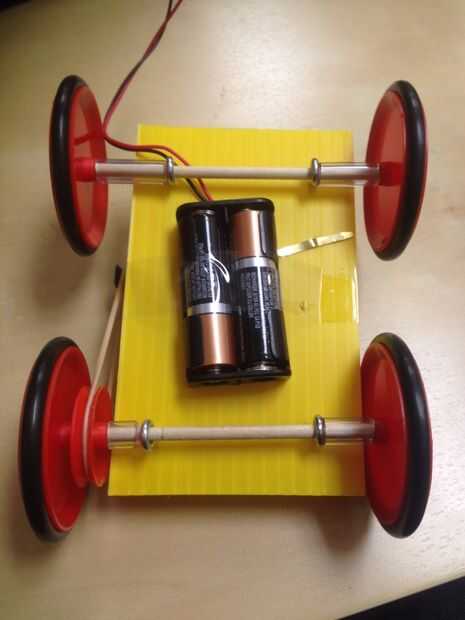 Podemos fijar el soporte de la batería y ponga pilas en la parte inferior del vehículo. Observe como los sujetadores de papel de latón.
