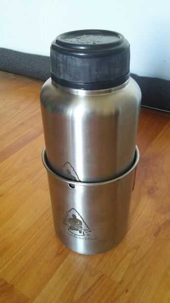 Así que mi equipo tiene 32oz botella de acero inoxidable, con tapa de baquelita que tiene una goma sello debajo. No haya fugas! Esta botella está sólidamente construida, solo diseño amurallado y será increíblemente difícil de abolladura o deformación de esta botella! Y siendo como es 32oz, esto es la cantidad de agua que una tableta de purificación solo puede purificar cuando cayó dentro de agua dudosa. Clever pensando en tienda de conquistadores! También, nunca hierve el agua con la tapa! Están pidiendo una explosión! Ser personas seguras. No tengo que mencionarlo... pero Darwin y Murphy tienen una forma de demostrar para arriba de vez en cuando.