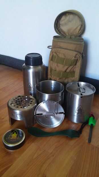 Así que aquí tenemos el kit, lo adquirido. Tiene un bolso de color marrón/tan, con un montón de correas de MOLLE y una bolsa frontal. Vino con un 32oz botella de acero inoxidable con tapa, 2 tazas de acero inoxidable, 2 tapas con construido en tamices que calcen bien en las copas. El kit también vino con un soporte de acero inoxidable con un recorte para que puedan alimentar a palos en el lado para mantener su fuego. También se incluyó una barra de ferro que se supone que brillan en la oscuridad (mío no, jaja), un plástico spork de Light My Fire (ok para ser usado en casa. Demasiado endeble para mi gusto), y una pequeña lata de lo que se llama "mini Braseros", que son de algodón de limpieza las, empaparon en algún tipo de combustible (aceite de la lámpara? queroseno?) y luego recubierta de cera. Quemar hot, largo y son grandes en incendio! La lata no cierra bien, por lo que envuelve con cinta aislante un poco. Problema solucionado y ahora resistente al agua!.