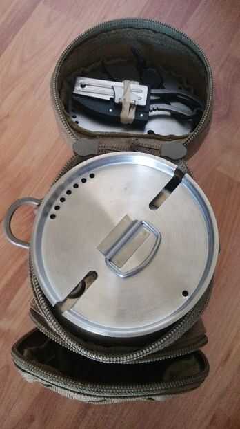 Entre las tapas de la taza 2, tengo un cuchillo pequeño cuello (marca CRKT) con un abrelatas de poder que se adjunta. Buen cuchillo de trabajo de copia de seguridad, bien poco. Es todo plano y tal, así que encaja a la perfección y es una barrera entre las 2 tapas de clanging uno contra el otro. Mi kit no hace ruido, que puede arruinar el disfrute de una excursión.